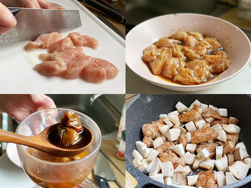 其中有一包是生的雞胸肉,當下馬上決定把珍藏的梅子拿出來做菜,這塊拿出來個頭跟手掌一樣大,感覺份量十足,先切塊使用醬油、米酒、胡椒調味後,入鍋乾煎後可以加上自己喜歡的其他食材炒一炒,再倒入自釀的梅子,中小火滾一陣子後出鍋,完全沒有管時間和考量雞胸肉會不會柴XD
