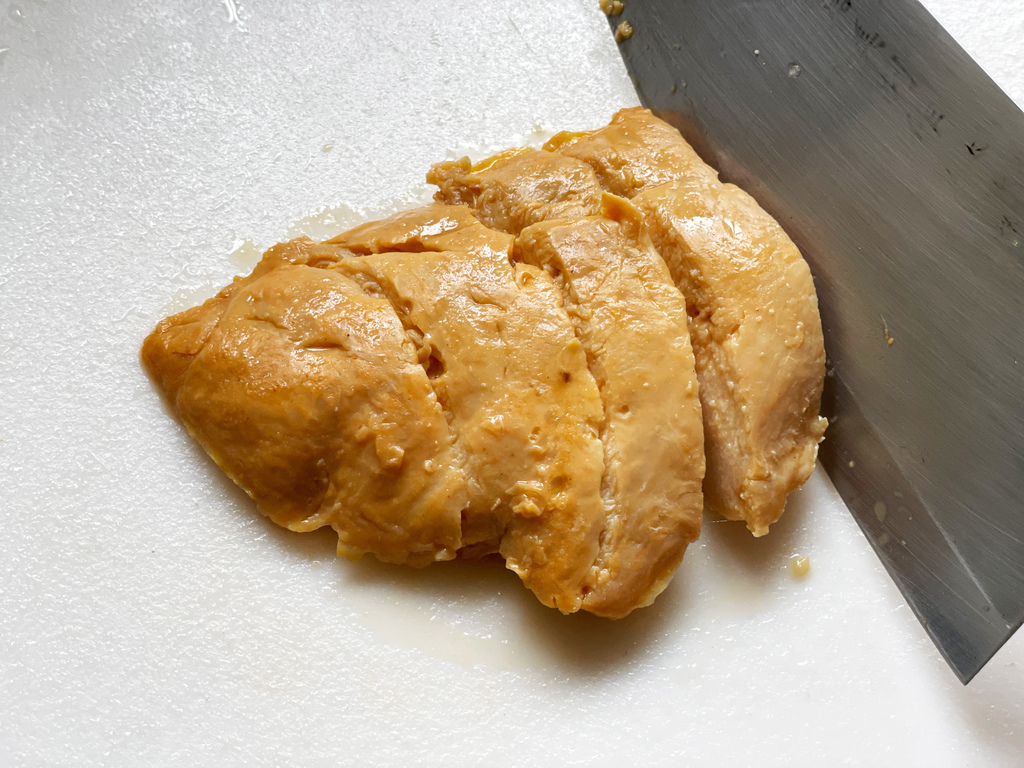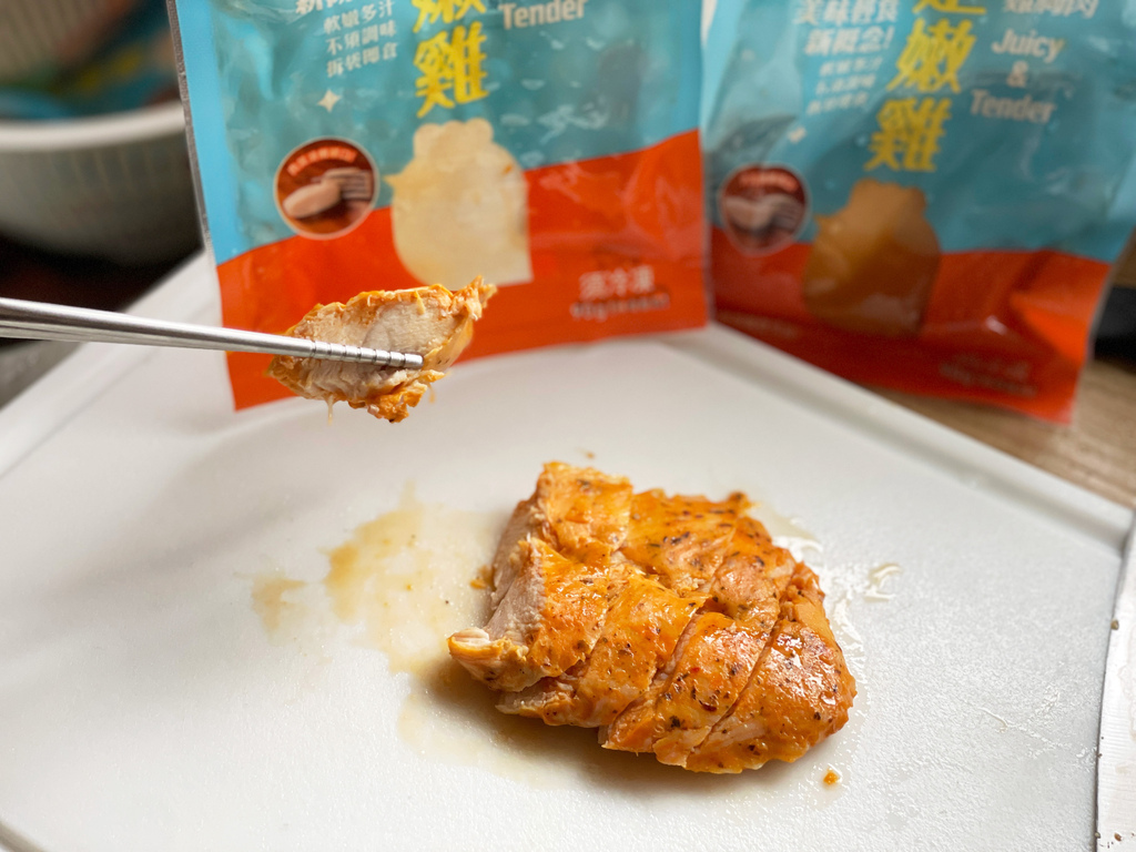雞胸肉退冰後,每一片拿出來的雞胸肉都有均勻地裹上醬汁,用煎的方式加熱後再小火蓋鍋悶,拿出來刀子一切開帶著微微的肉汁,一入口現場跟朋友大眼瞪小眼,一起驚呼真的超級嫩!一瞬間變成餓死鬼一樣搶食,當天一共嗑了四種雞胸肉哈哈哈哈